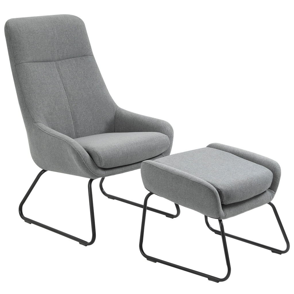 La poltrona relax con pouf poggiapiedi porta comodità e stile a casa tua. Il design contemporaneo e dalle linee minimaliste la rende perfetta per abbinarsi a ogni tuo tipo di arredamento. Con una comoda imbottitura, schienale alto e poggiapiedi incluso, questo set ti garantisce la massima comodità per rilassarti a casa. La solida base in metallo assicura una stabilità ottimale e i piedini antigraffio proteggono il tuo pavimento. Porta un tocco di novità nei tuoi ambienti!