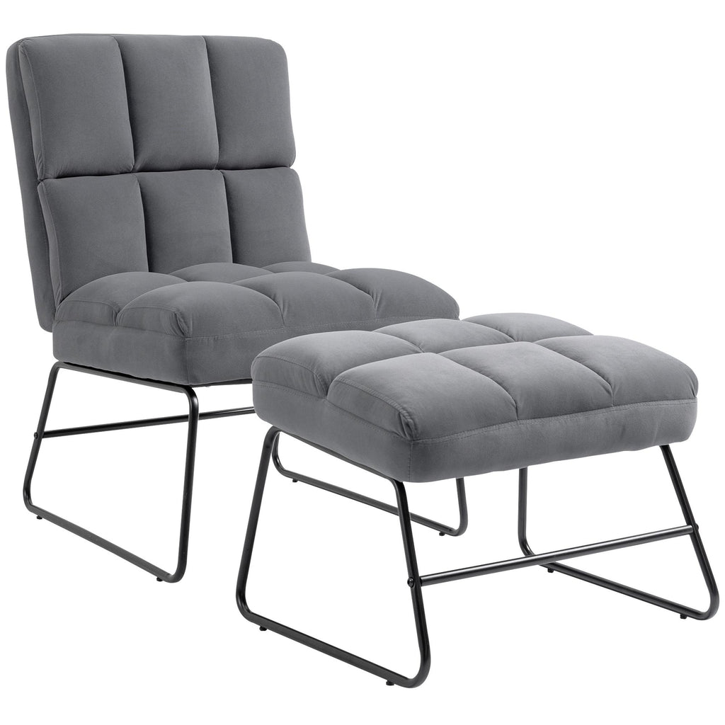 Poltrona Imbottita con Poggiapiedi Pouf in Tessuto Effetto Velluto Grigio