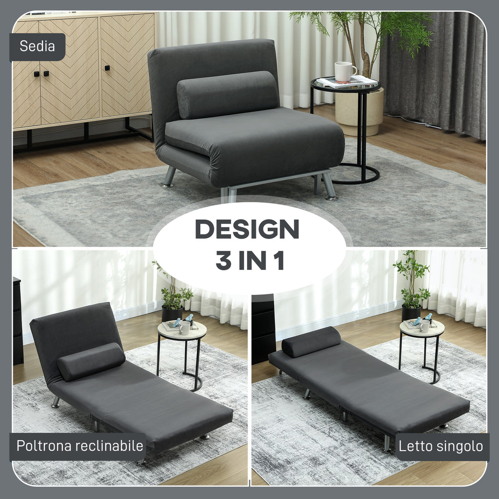 Poltrona Letto Singolo 3 in 1 75x70x75 cm in Tessuto Effetto Lino Grigio Scuro