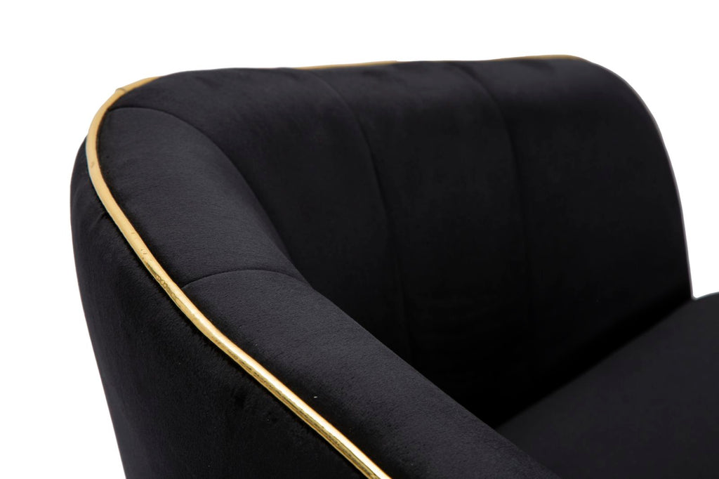 Poltrona in tessuto nero imbottito con rifiniture dorate e gambe in legno nero con dettagli in oro. L'eleganza del nero e dell'oro unite per offrire un comodo relax.