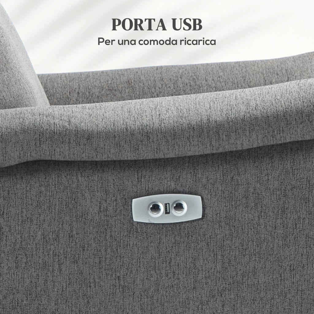 Poltrona elettrica controllabile mediante pulsante laterale. Poltrona reclinabile fino a 160 °. Poltrona con poggiapiedi integrato per garantire un completo relax. Presa USB integrata. Poltrona imbottita in gommapiuma. La fodera in tessuto effetto lino (poliestere) è traspirante e resistente. Poltrona moderna perfetta per il soggiorno o la camera da letto. Montaggio richiesto.