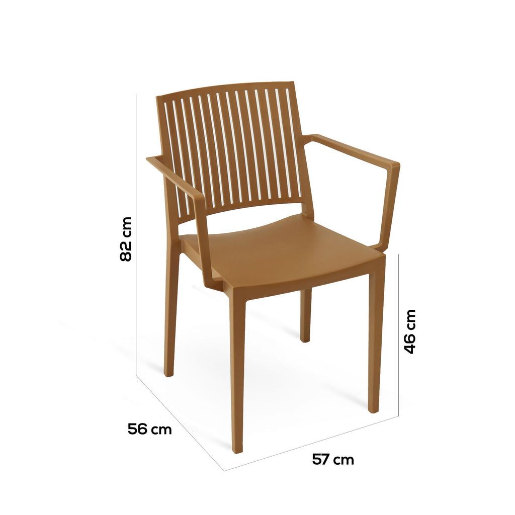 Poltrona con braccioli interamente realizzata in polipropilene camel. Dimensione: 57*56*H82 cm Altezza seduta: 46 cm Colore: Nero Materiali: Polipropilene Cura del prodotto: Detergere con panno umido e acqua tiepida, smacchiare solo con prodotti specifici