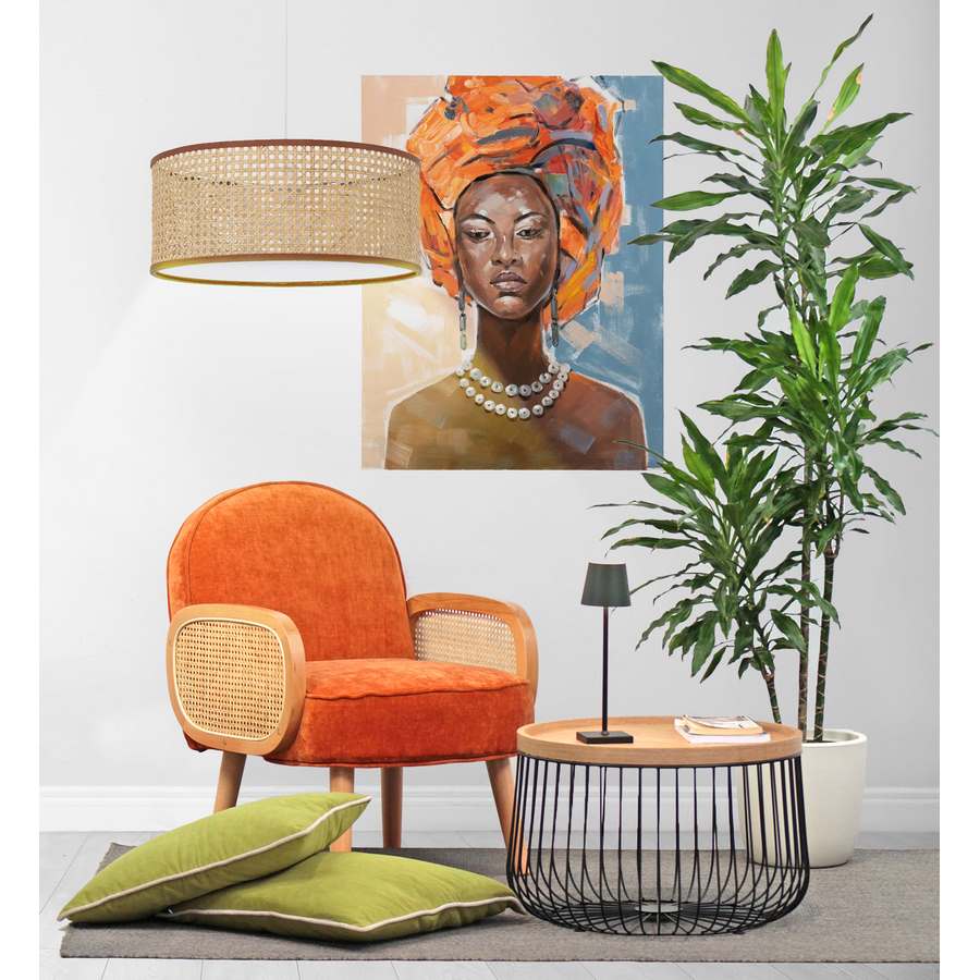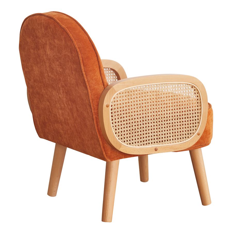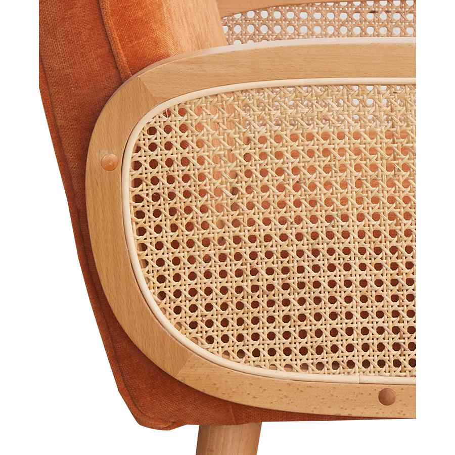 Poltrona design colorata Doris: L'intramontabile stile vintage è stato contaminato dal design moderno e nordico, rendendo questa poltroncina da salotto unica nel suo genere. Doris presenta una resistente struttura in legno di faggio e un rivestimento in tessuto color arancio impreziosito da braccioli in legno di rattan e paglia di vienna.