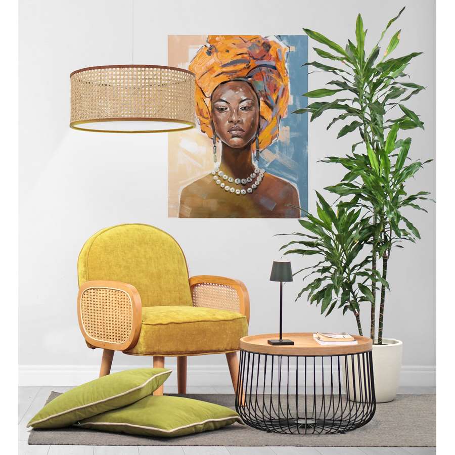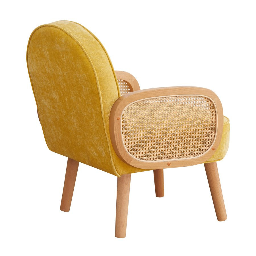 Poltrona in tessuto Doris è una rivisitazione del classico stile mid century a cui si aggiungono influenze scandinave e moderne. Questa poltroncina da salotto, ha una solida struttura in legno di faggio e un rivestimento in tessuto color ocra impreziosito da braccioli in legno di rattan e paglia di vienna.