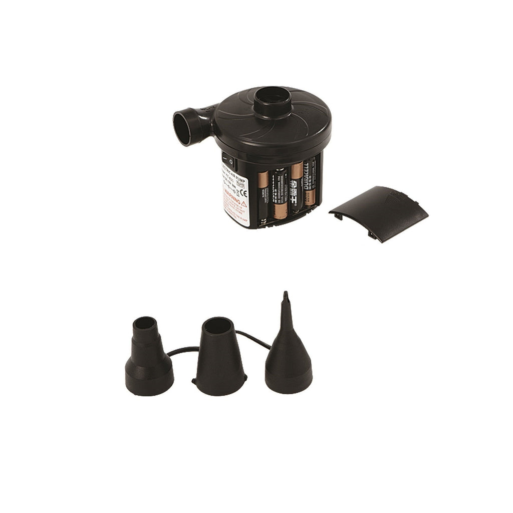 Pompa elettrica ZRAY alimentabile a batteria fornita con 3 adattatori di tipo universale compatibili con la maggior parte delle valvole dei prodotti gonfiabili in commercio.