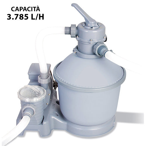 Pompa filtrante a sabbia efficace, facile da utilizzare, estremamente comoda e poco costosa perché, a differenza delle tradizionali pompe, non richiede cartucce di ricarica, ma solo sabbia da ricaricare quando questa è sporca! Il suo funzionamento è molto semplice e simula in un certo modo quello che avviene in natura: l'acqua viene pompata all'interno del serbatoio contenente sabbia di silice e proprio come avviene in natura, questa ne trattiene impurità e particelle, per restituire acqua pulita alla piscina. In materiale anticorrosione con serbatoio da 18 kg per sabbia silica n. 20 da 0,45 a 0,55 mm. Per piscine e connettori di Ø 32 e 38 mm. SABBIA NON INCLUSA. Capacità 3785 litri ora. Include tubi e raccordi per il collegamento.