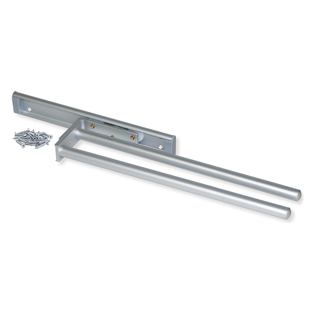 Pratico porta asciugamani estraibile per cucina o bagno prodotto in alluminio con finitura anotizzata opaca o bianca. Dispone di due bracci per appendere asciugamani o strofinacci, può essere girato di 90° in base all'utilizzo sul fianco del mobile o sotto un ripiano (viti di montaggio incluse). Telescopico grazie alla guida che possiede, ciò lo rende molto accessibile.
