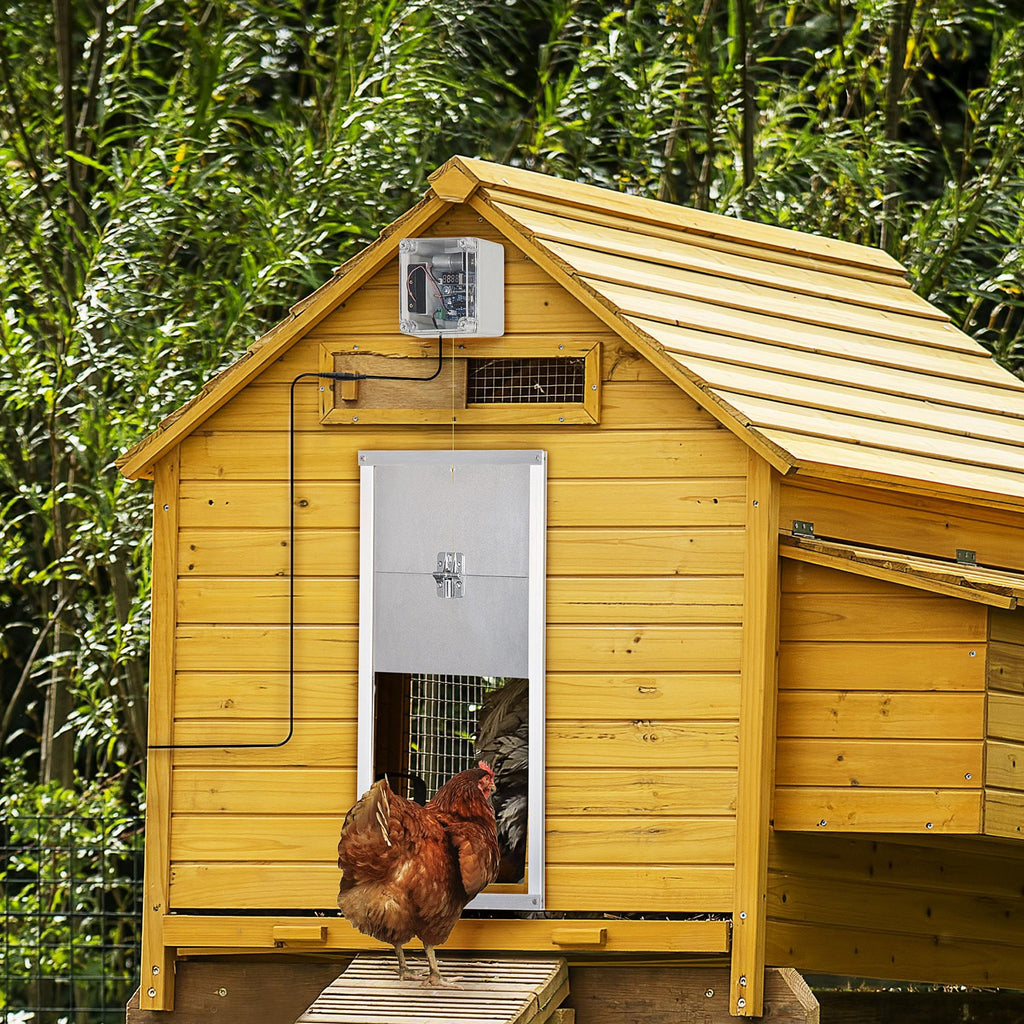 Scegli questa porta automatica per pollaio per tenere al sicuro i tuoi polli. Sono presenti due modalità di apertura: con il timer da regolare o col sensore di luce. Può essere alimentata a batterie o collegata direttamente con un adattatore. Sono presenti due telecomandi per controllare la porta con il semplice tocco di un dito. Il corpo in alluminio protegge efficacemente dai predatori, e puoi usarla in ogni stagione dal momento che è a prova di intemperie.
