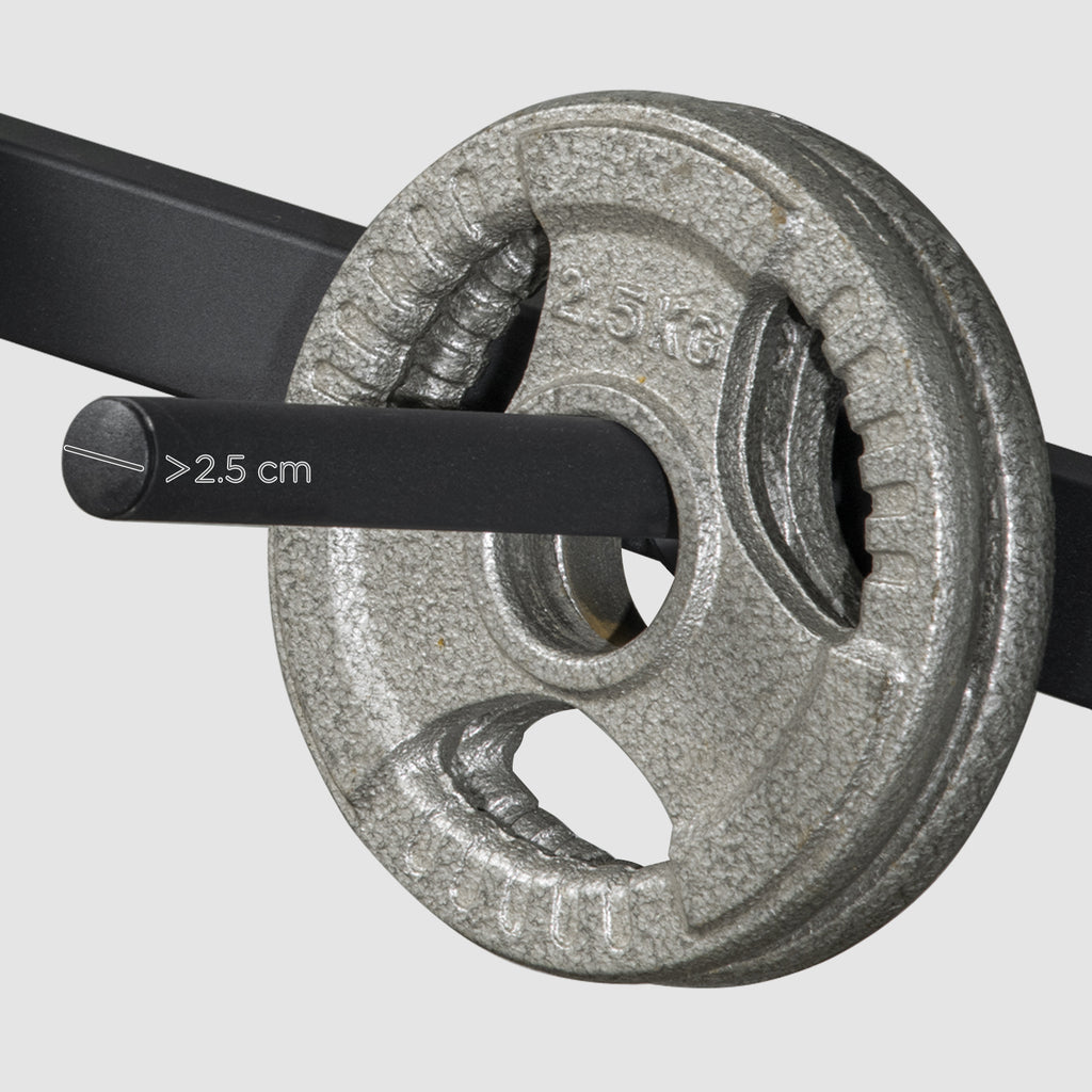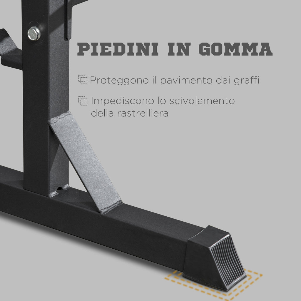 - SPAZIO PER I DISCHI PESI: Il rack porta bilanciere è dotato di 7 perni in cui puoi impilare i tuoi dischi con foro superiore a Ø2,5cm. Dal lato opposto sono presenti supporti per sostenere 4 barre