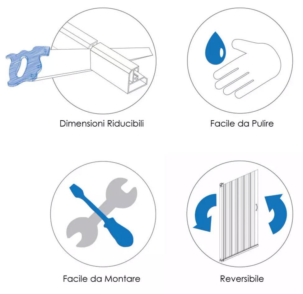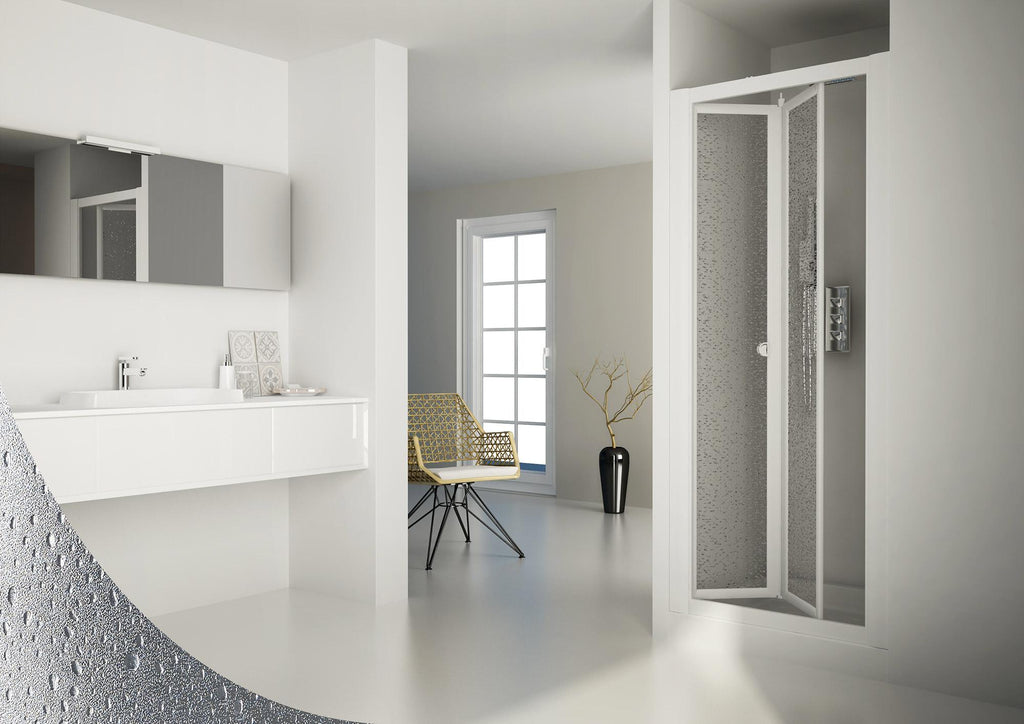 Parete doccia con apertura a libro scorrevole con profili in pvc strutturato e vetro acrilico, riducibile e reversibile.