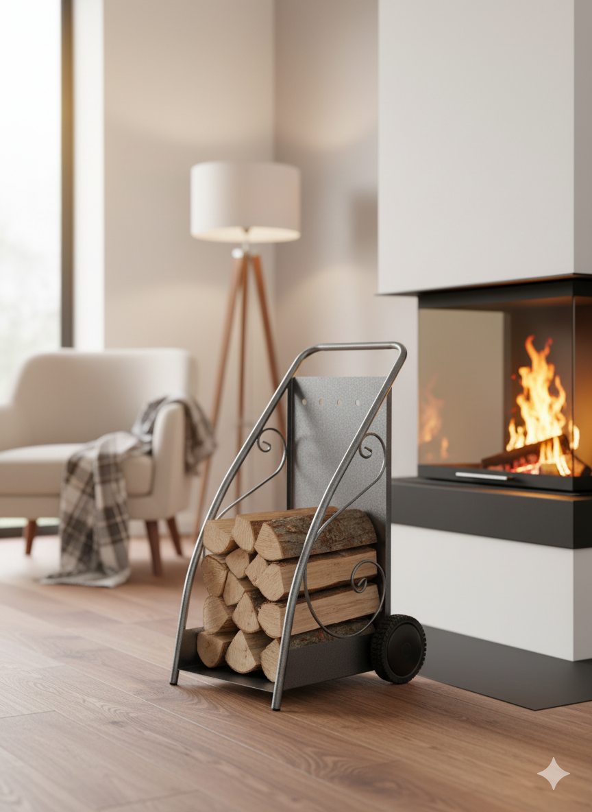 Porta Legna Design Classico con Ruote 47,7x50x90 cm in Ferro Verniciato Grigio Martellato - La Ferrotecnica