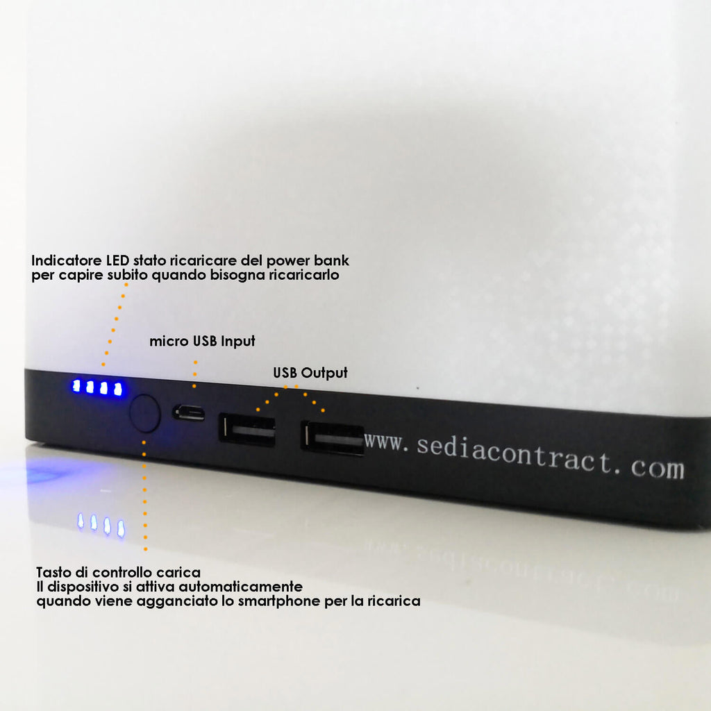 Sono presenti anche due uscite USB così da poter alimentare fino a 5 dispositivi mobili contemporaneamente e un ingresso micro-USB per poter ricaricare il Power Bank. Dispone di un pulsante con 4 luci led per controllare lo stato di carica del Power Bank.