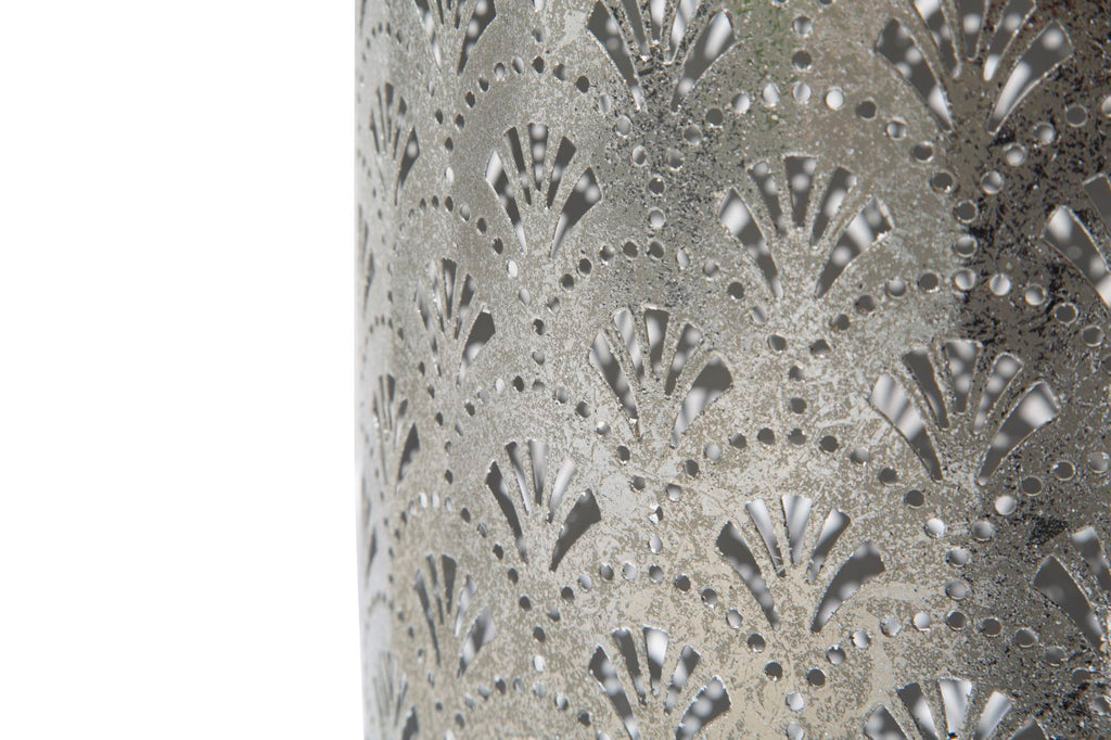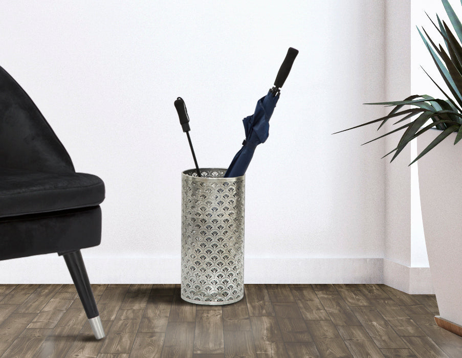 Portaombrelli rotondo in metallo argento. Gli intarsi floreali lo rendono un pratico complemento che non può mancare in ogni ingresso dallo stile ricercato.