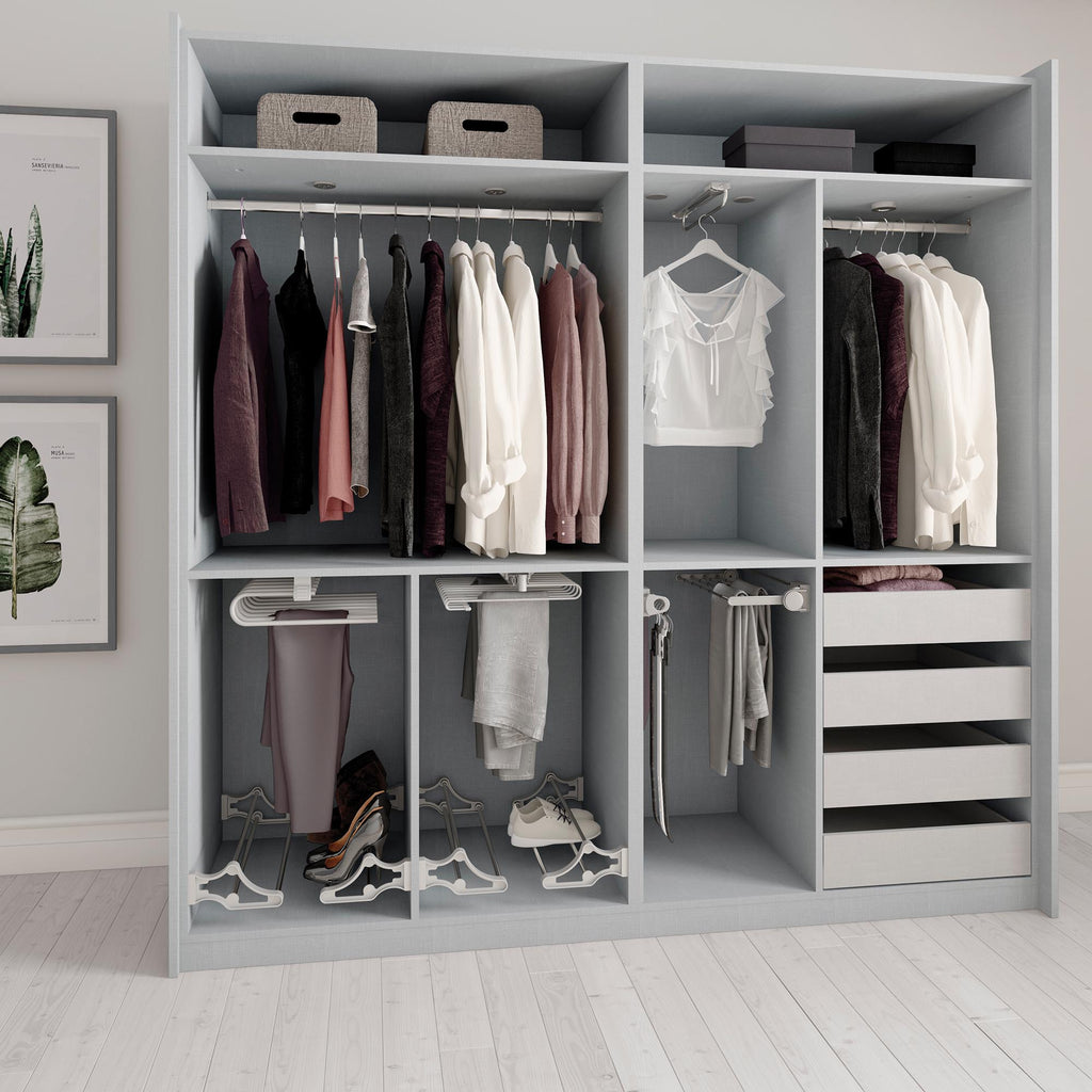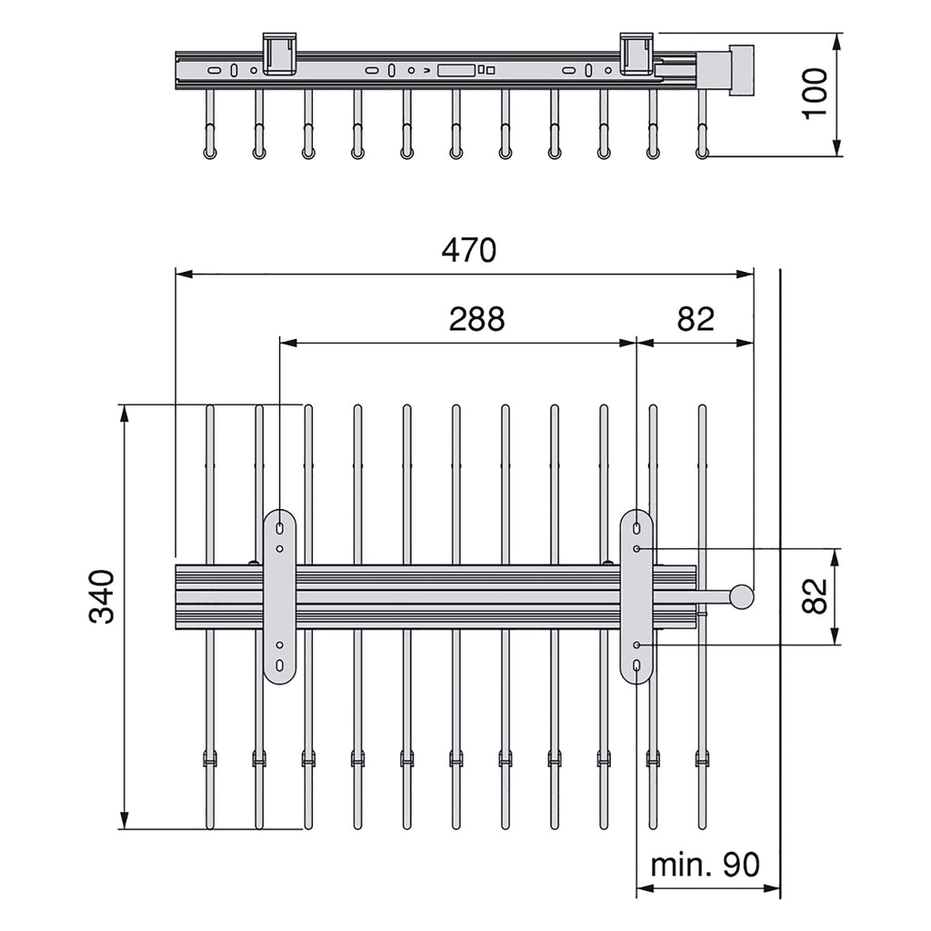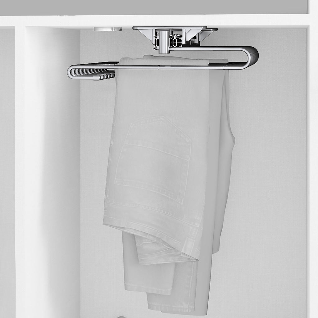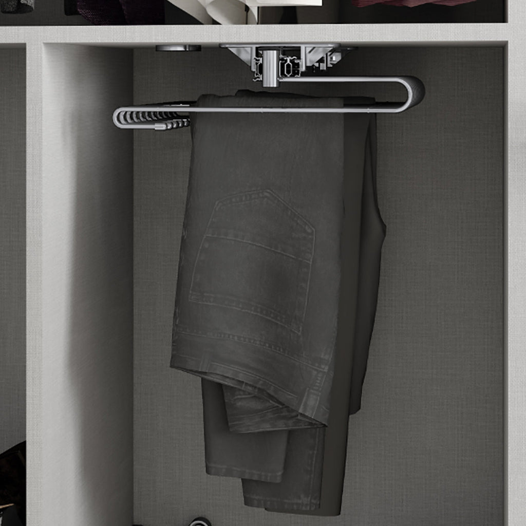 Il porta pantaloni estraibile Self permette di organizzare in modo efficiente lo spazio interno degli armadi e cabine armadio, facilantando l'accesso degli indumenti. È prodotto in acciaio cromato, dispone di guide a sfere ad estrazione totale. Con 11 aste per appendere pantalocni così come una maniglia nella parte frontale per faciliatare l'estrazione del meccanismo.