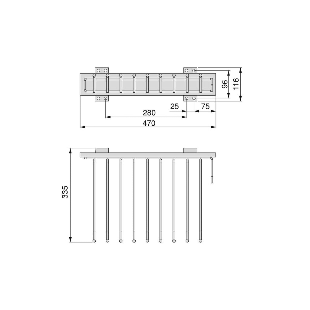 . Montaggio semplice nel laterale, la cui estrazione avviene tramite guide a rulli per lo scorrimento. Dispone di 9 bacchette che includono guarnizioni antiscivolo per fare in modo che gli abiti non cadano. Inoltre dispone di un pomello frontale per facilitarne l' estrazione.È fabbricato in alluminio con bacchetta di acciaio cromato e i supporti di plastica nera.