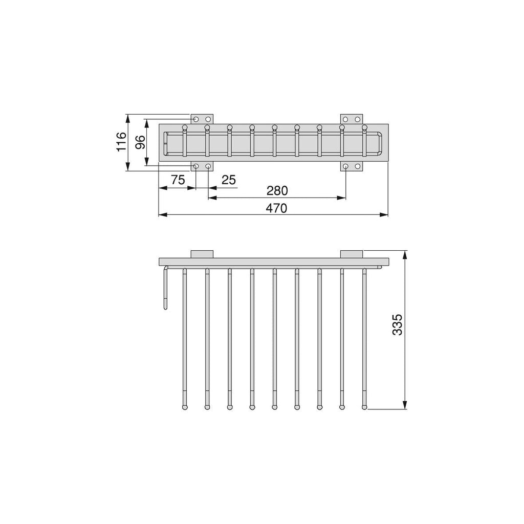 . Montaggio semplice nel laterale, la cui estrazione avviene tramite guide a rulli per lo scorrimento. Dispone di 9 bacchette che includono guarnizioni antiscivolo per fare in modo che gli abiti non cadano. Inoltre dispone di un pomello frontale per facilitarne l' estrazione.È fabbricato in alluminio con bacchetta di acciaio cromato e i supporti di plastica nera.