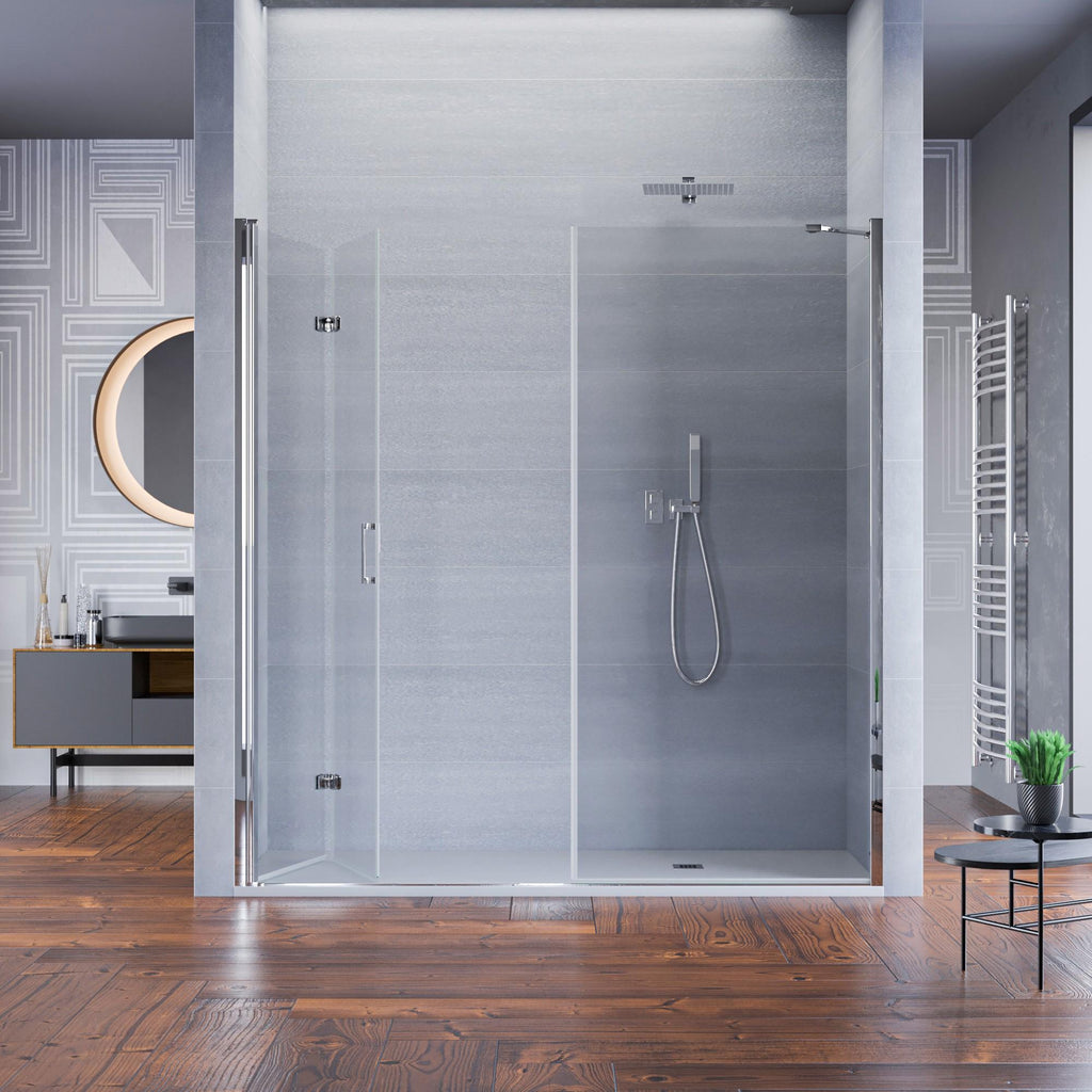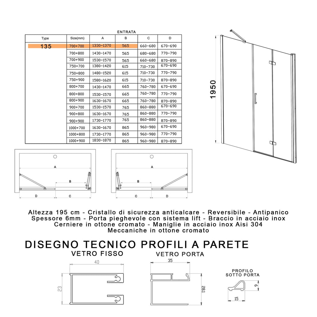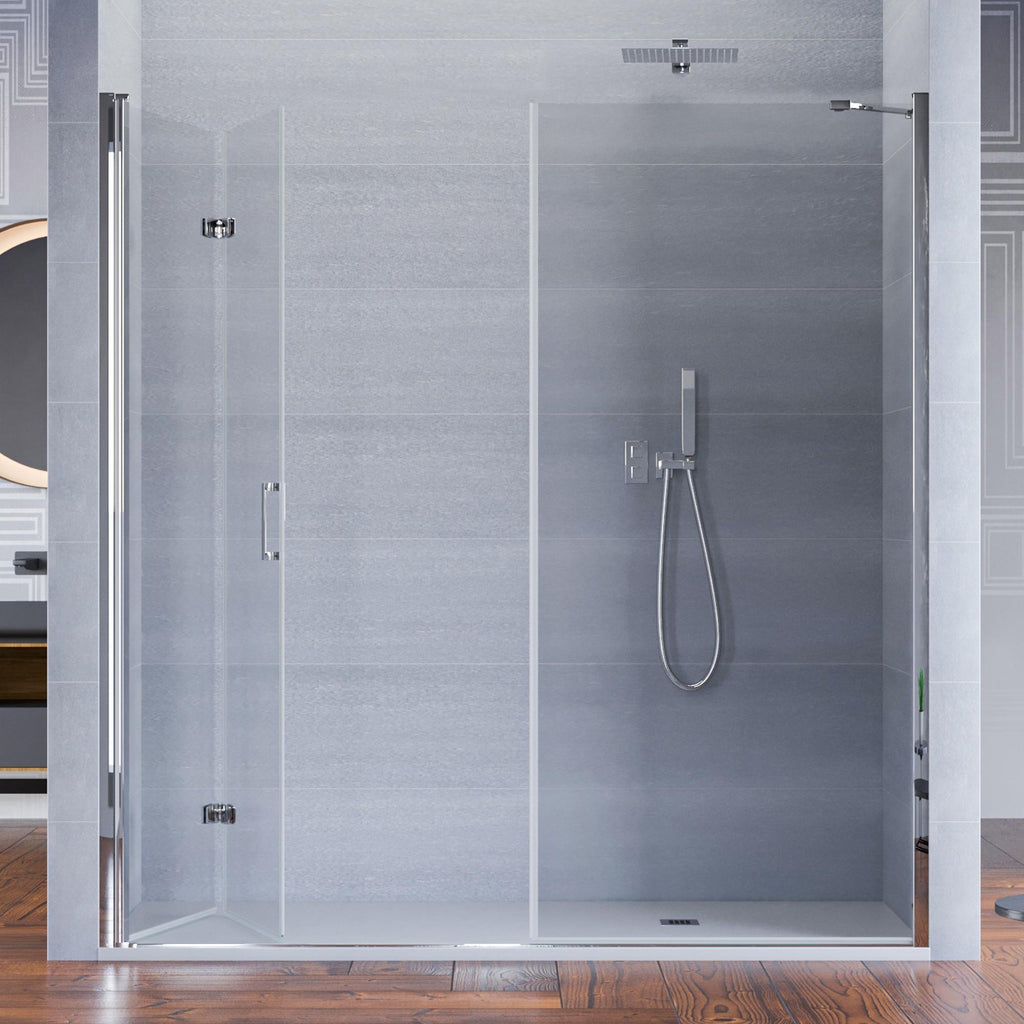 Porta doccia due lati in linea, porta doccia a soffietto pieghevole e lato fisso in cristallo trasparente arricchito con trattamento anticalcare Nano k1. Comode maniglie in acciaio inox Aisi 304 interna esterna. Porta doccia dotata di sistema LIFT per mantenere in modo corretto la posizione. Questa cabina doccia con porta pieghevole è un vero complemento di design per il vostro bagno.