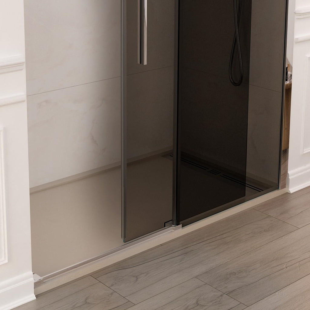 Nicchia scorrevole per doccia in cristallo fumé 8mm. Porta doccia di lusso con finiture e meccanismi di qualità fantastica. Ruote in ottone cromato, maniglie in acciaio inox aisi 304. Sgancio rapido inferiore per una facile pulizia. Guarnizioni trasparenti semi rigide anti deformazione. Altezza 195cm in cristallo temperato di sicurezza. Barriera sotto porta con un alto grado di contenimento degli schizzi. Componentistica inferiore ferma binario in ottone cromato da non confondere con la plastica.