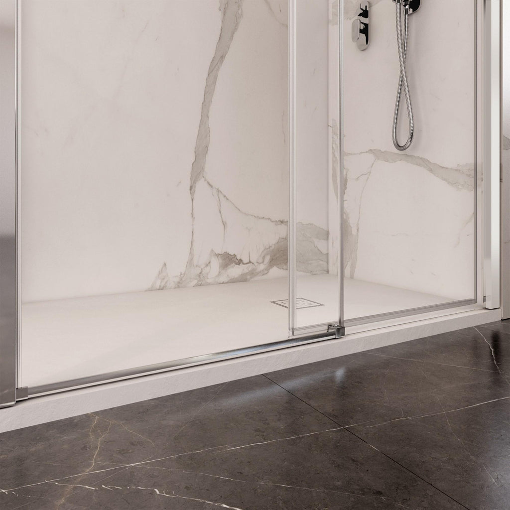 Porta doccia nicchia scorrevole in cristallo trasparente, porta dotata di chiusura magnetica per una perfetta tenuta dell'acqua, cristallo 6mm con trattamento anti calcare che evita le formazioni di calcare e facilita la pulizia permettendo la rimozione di impurità solo con acqua calda. Ti permette di Risparmiare non dovendo più comprare prodotti specifici. Installabile a filo pavimento o su piatto doccia. Rotelle in acciaio inox e teflon.