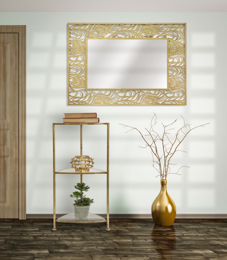 Mobiletto portatelefono in metallo dorato con 3 ripiani in specchio. La particolare forma triangolare con i lati arrotondati creano un effetto avvolgente e di gran classe.