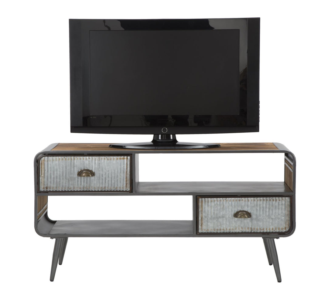 Mobile porta tv in metallo e legno con 2 ripiani e 2 cassetti. La linea Illinois si ispira allo stile industrial più cool. Ferro e legno insieme creano un contrasto forte e d'impatto