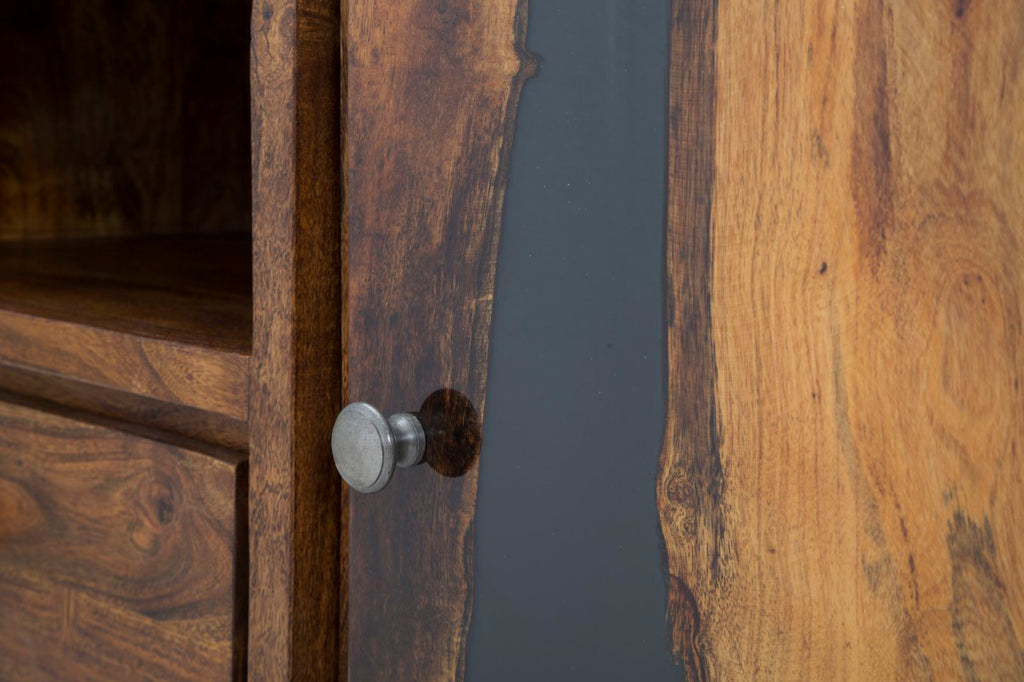 Elegante mobile porta tv in legno massello di acacia composta da 2 ripiani, 2 ante e 2 cassetti. La particolare lavorazione con resina incastonata sulle ante dona un tocco di colore e modernità ad un pezzo estrememante elegante e classico.