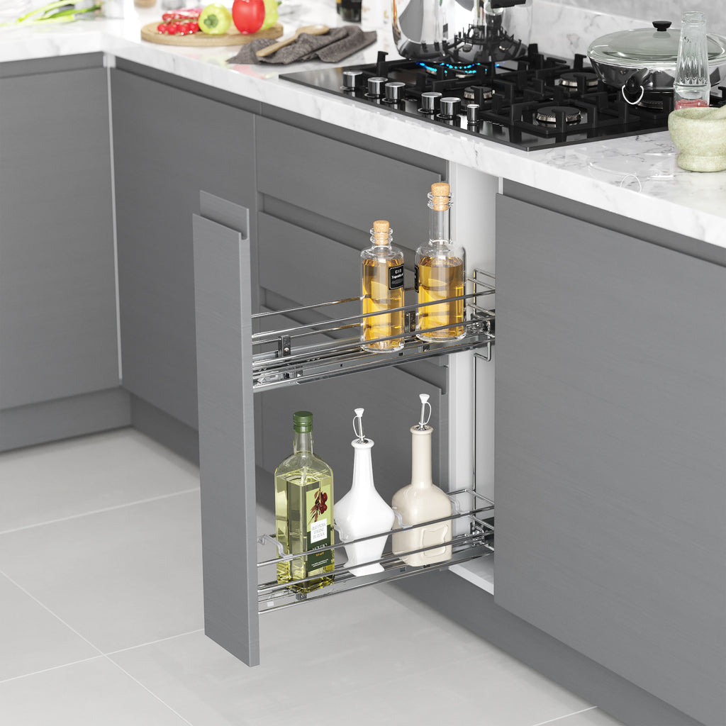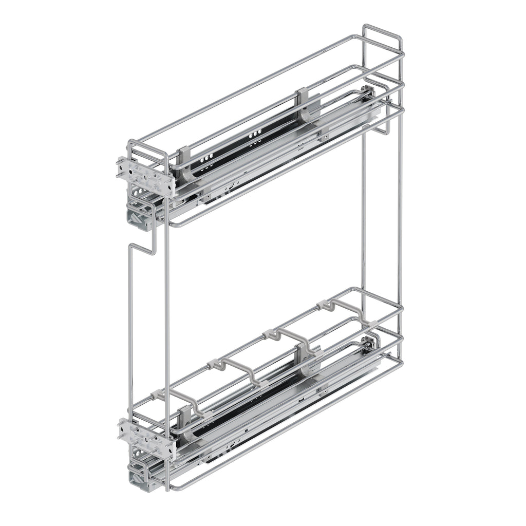 Portabottiglie estraibile per basi da cucina in acciaio cromato, ideale per piccoli spazi o unità ausiliarie. Di facile installazione: si fissa sul lato sinistro dell'unità con regolazione totale della porta. La struttura è in acciaio cromato con 2 livelli e incorpora guide a rulli con estrazione totale e chiusura morbida, che permettono uno scorrimento fluido del sistema evitando urti. Il cestino inferiore ha 4 scomparti per organizzare le bottiglie. Capacità di carico fino a 30 kg.