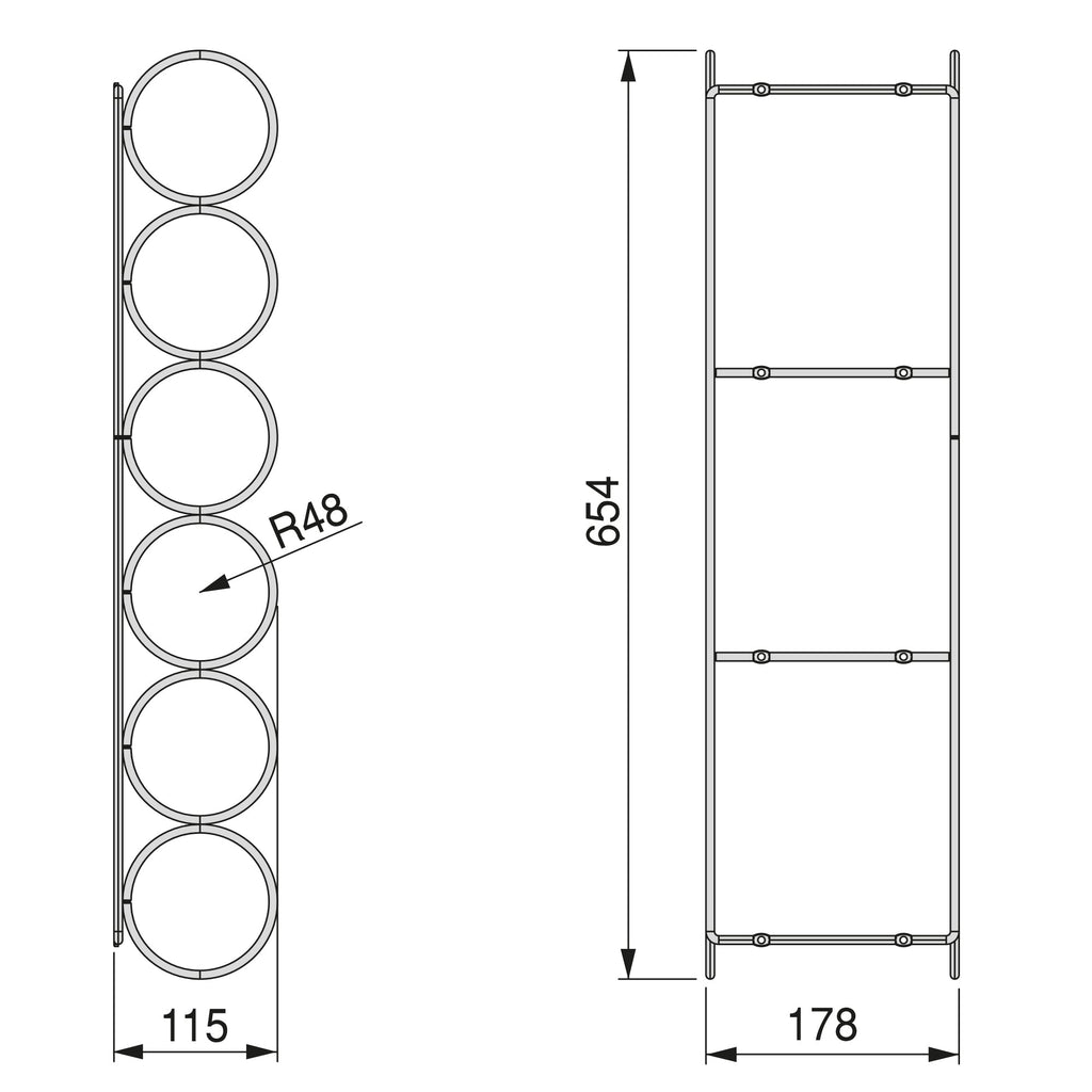 Misura 654 x 178 mm con una capacità di 6 bottiglie con un diametro massimo di 95 mm e il suo design in filo di acciaio cromato si adatta a qualsiasi stile di cucina. Si caratterizza per la sua facile installazione sotto il fondo della mensola mediante le viti incluse.