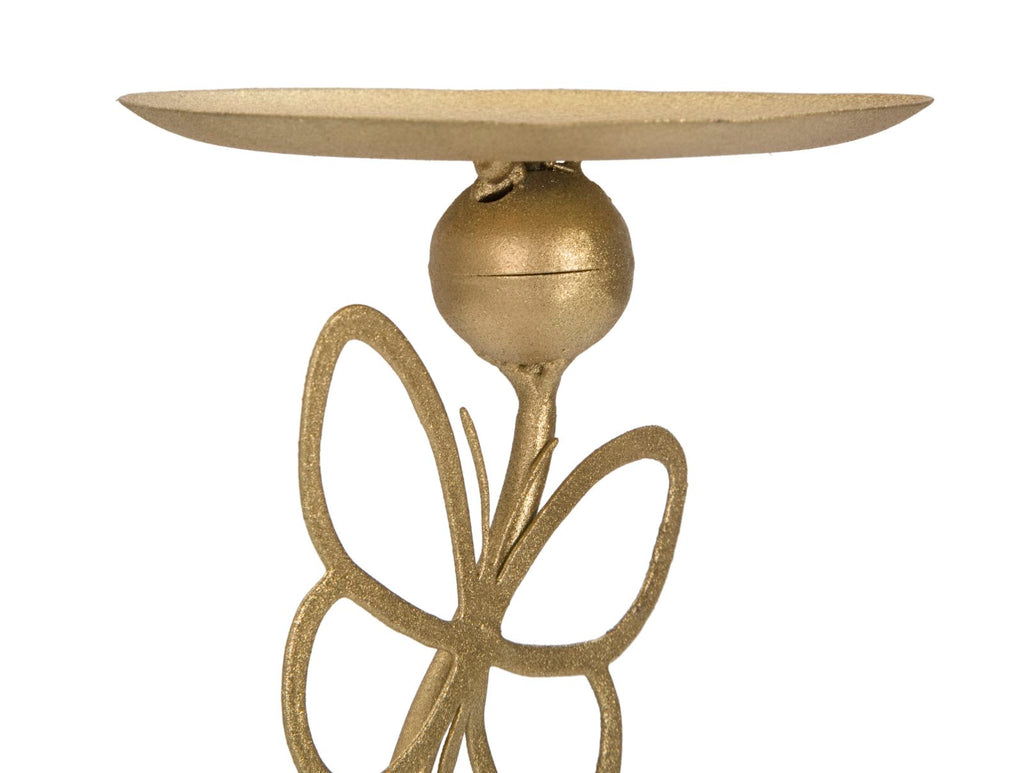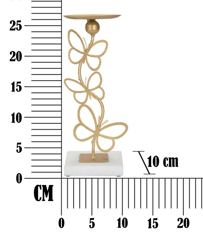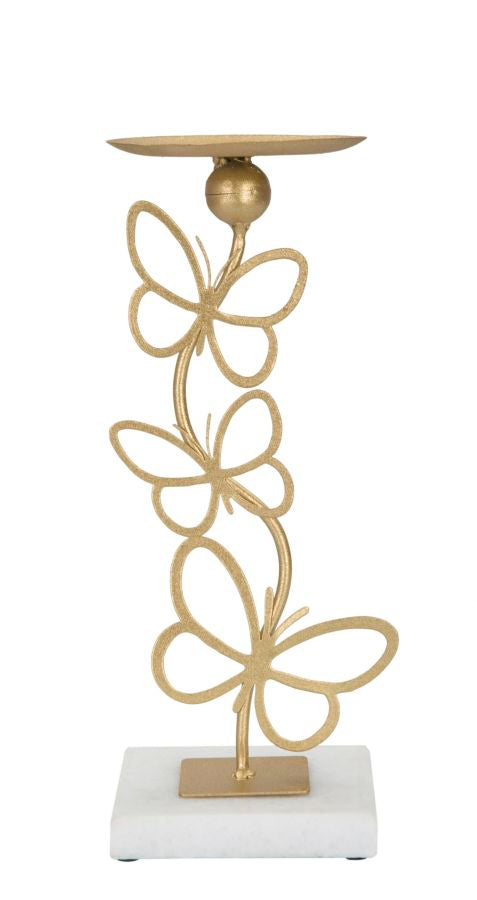 Elegante portacandele in metallo dorato con base quadrata in marmo bianco. La linea sinuosa è elegantemente decorata da farfalle in volo.