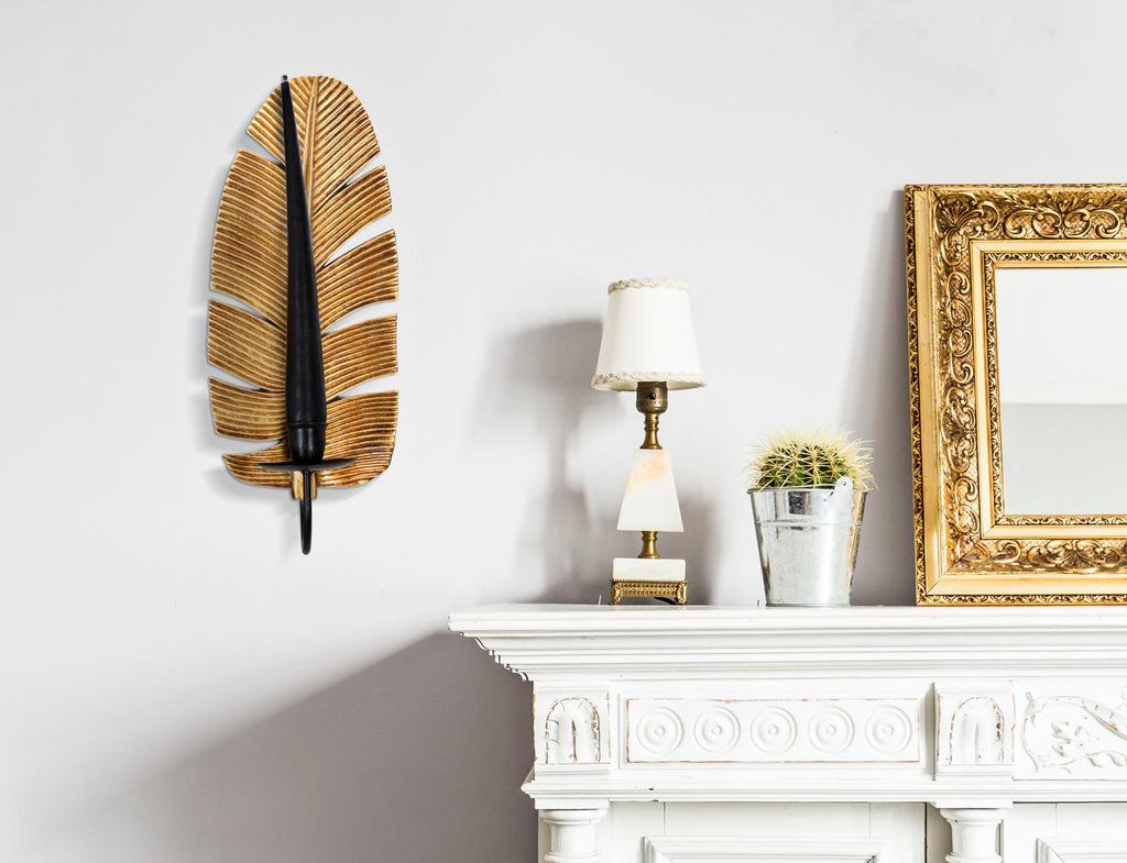 Elegante portacandele da parete in metallo dorato e nero a forma di foglia di palma. Un tocco esotico e glam per la tua casa.