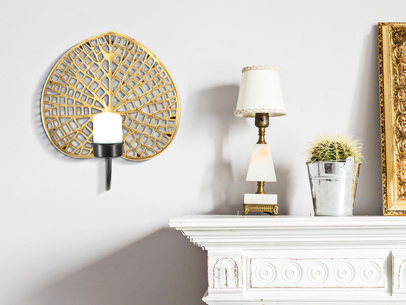 Elegante portacandele da parete in metallo dorato e nero a forma di foglia di loto. Un tocco esotico e glam per la tua casa.