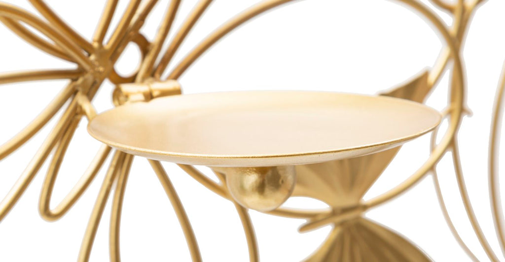 Portacandele da parete in metallo dorato con linee e decorazioni che compongono un insieme di farfalle in volo. Può contenere 3 candele.