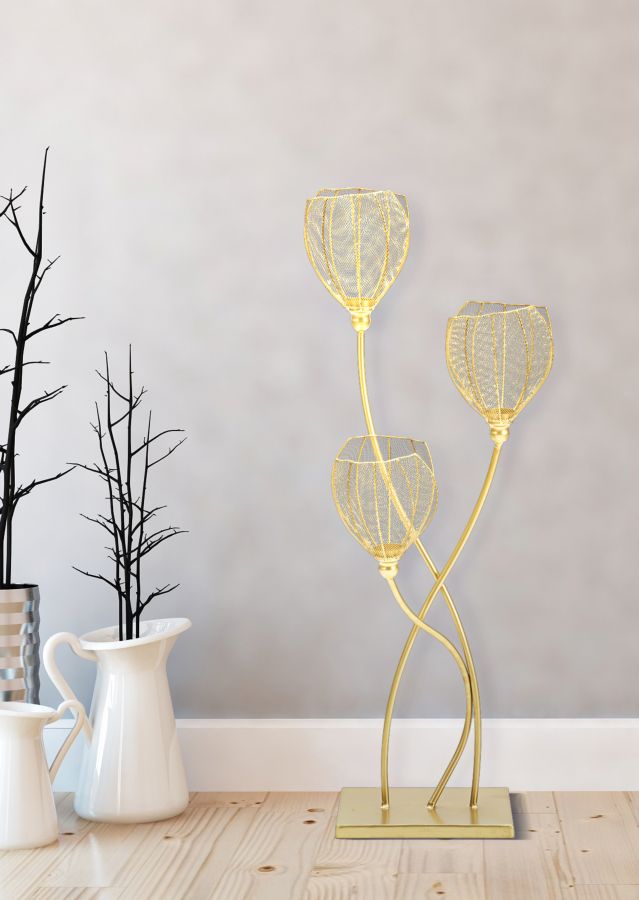 Elegante portacandele 3 fuochi in stile glam in metallo dorato dal design floreale ideale per portare un tocco di freschezza ad ogni ambiente.