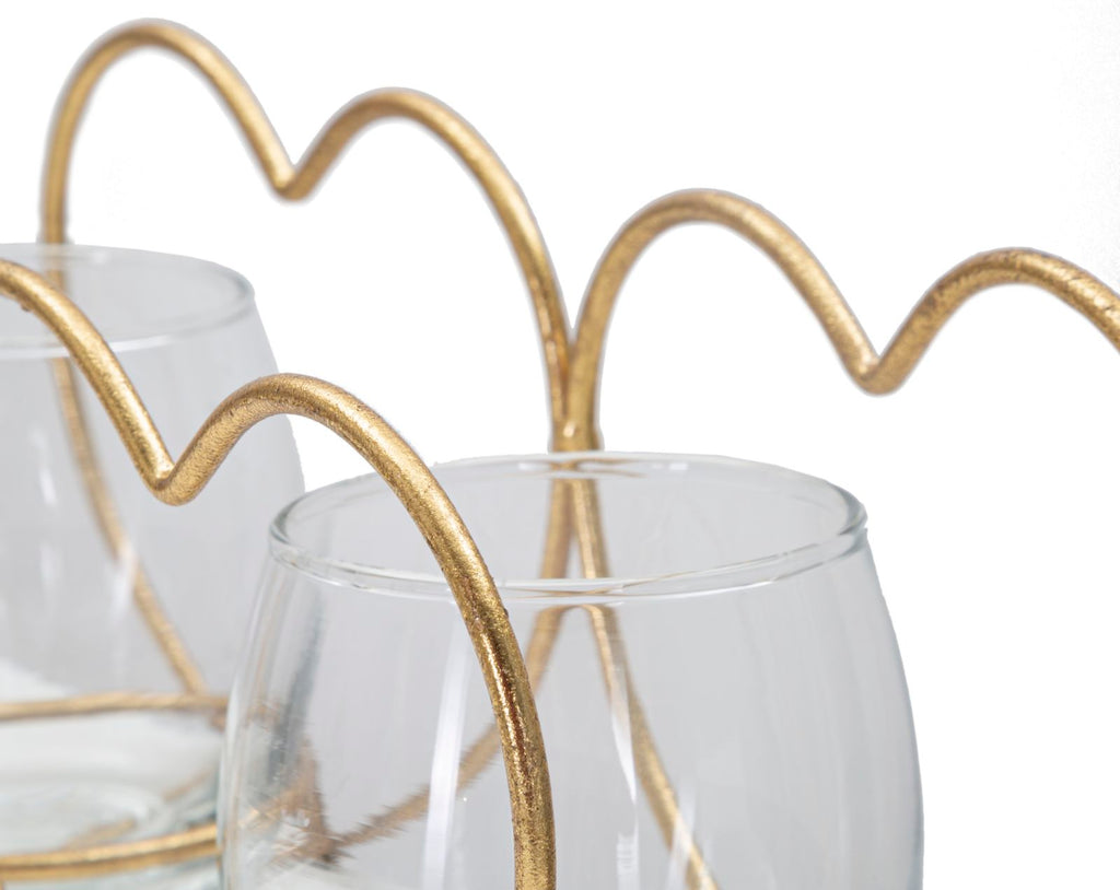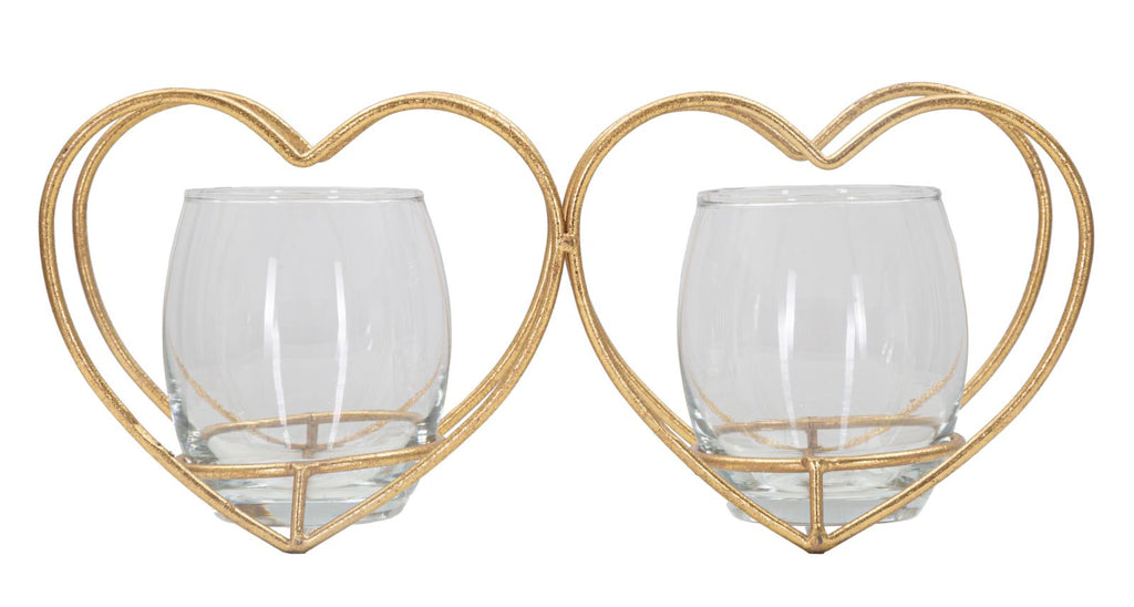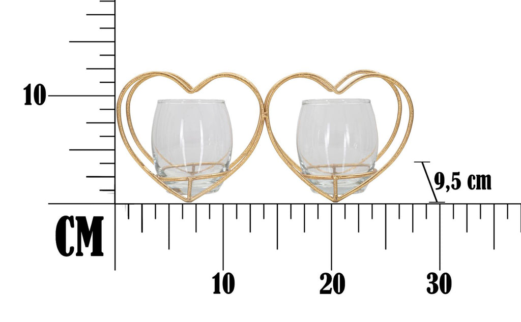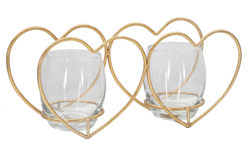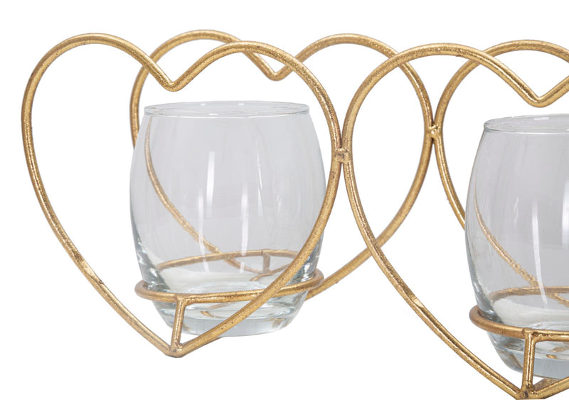 Elegante portacandele in metallo dorato a forma di cuori con bicchierini in vetro dal design semplice ma d'impatto. Può contenere 2 candele.