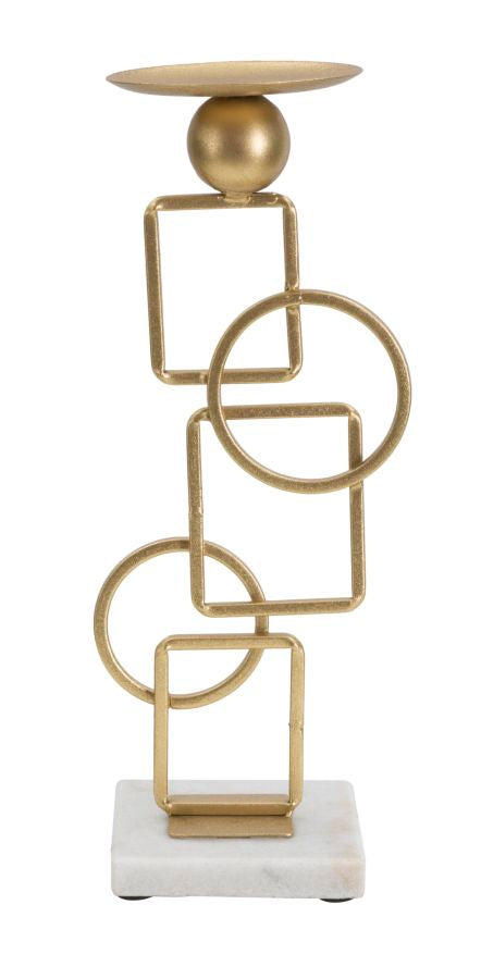 Elegante portacandele in metallo dorato con base in marmo. Il design geometrico dona in tocco di classe ad ogni ambiente.