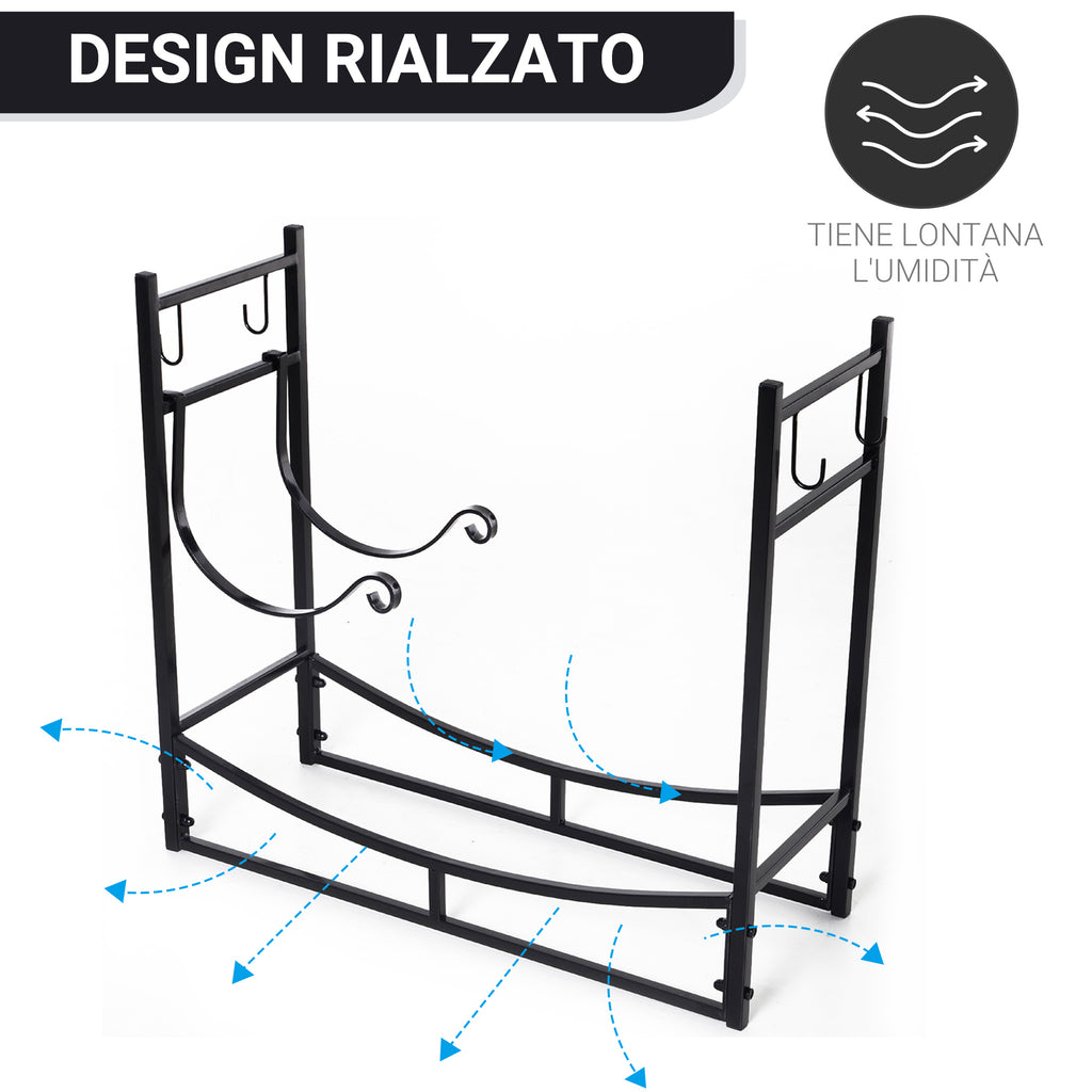 - MULTIFUNZIONE: Questo elegante portalegna in ferro è dotato di 2 supporti rimovibili per appoggiare rami e legna, e 4 ganci su cui appendere gli accessori per il camino. Questo supporto è ideale anche per far asciugare la legna, grazie al suo design rialzato che tiene lontana l'umidità del terreno