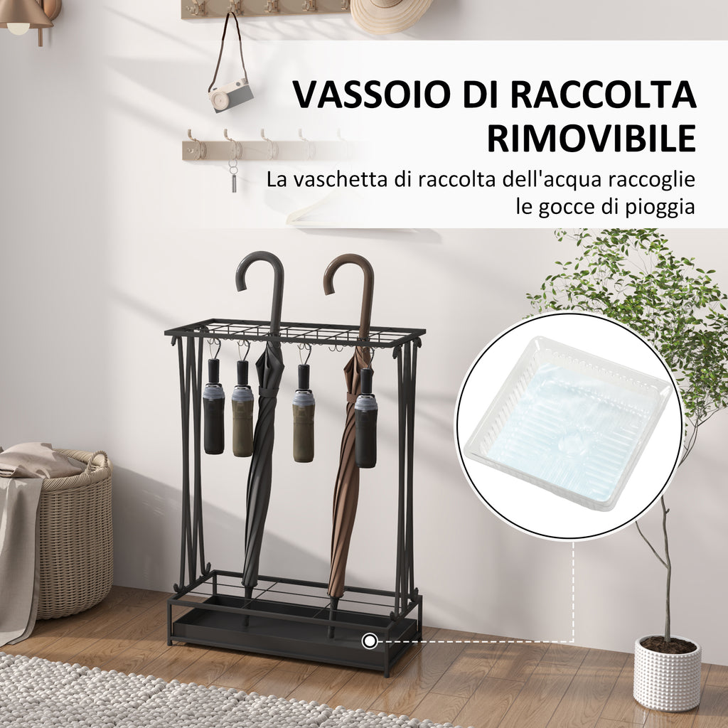 Portaombrelli 50x24x68 cm con Vaschetta per l'Acqua 21 Fori e 24 Ganci in Acciaio Nero