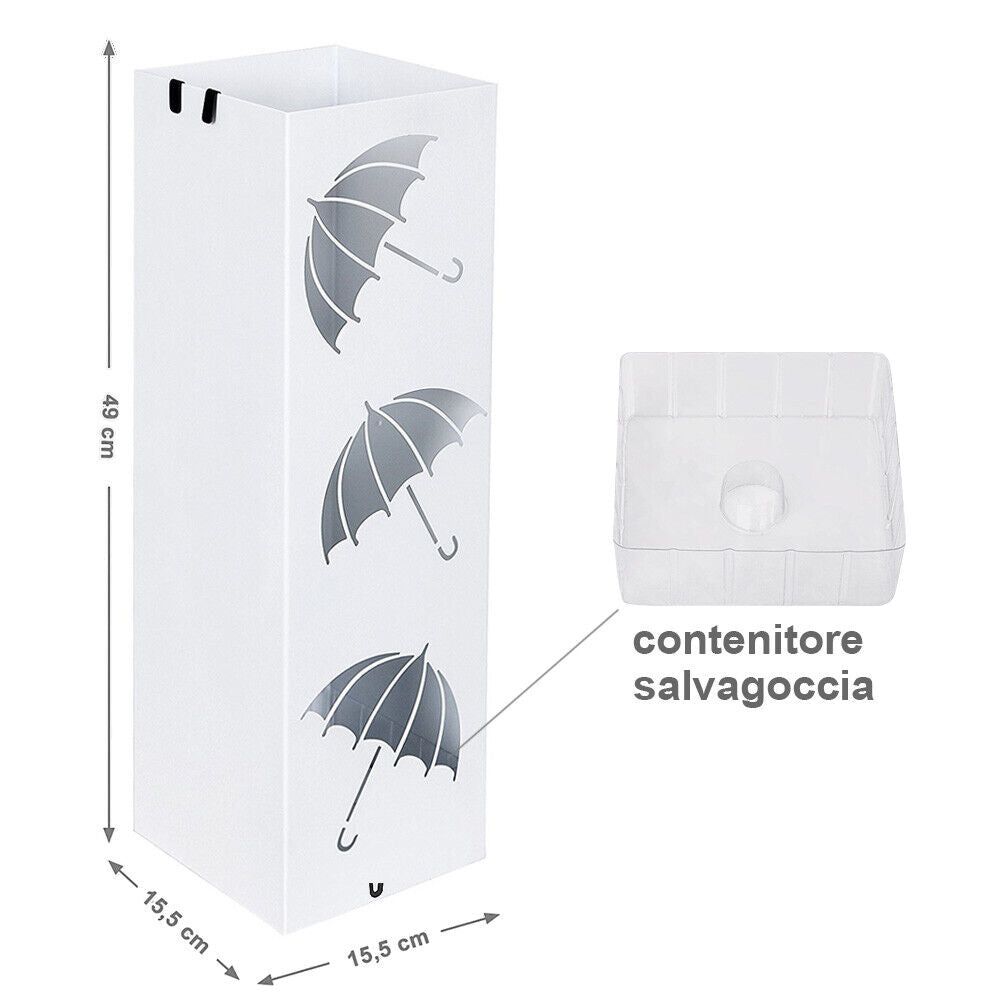 Portaombrelli in Metallo Design Quadrato Stand Bianco Vaschetta Salvagoccia