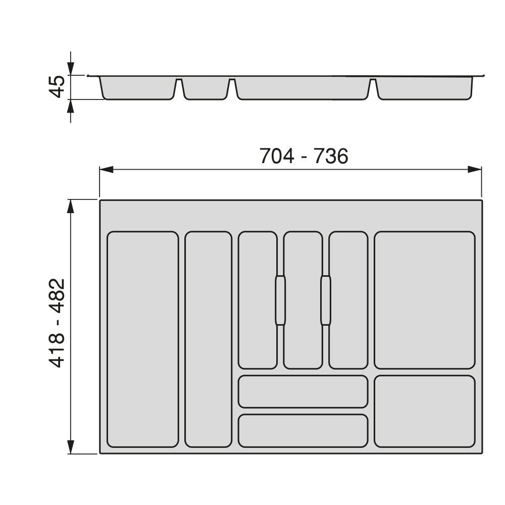 Portaposate per cassetti da cucina universale con un design lineare e grande capienza per posate ed altri utensili da cucina ottimizzando al massimo lo spazio. Poiché sono rifilabili possono essere dimensionati per l'uso con cassetti montati su moduli larghezza standard tra 400 mm e 1000 mm , di profondità tra 450 mm e 500 mm con pannello di spessori tra 16 mm e 19 mm secondo il modulo selezionato.