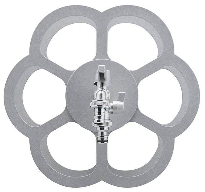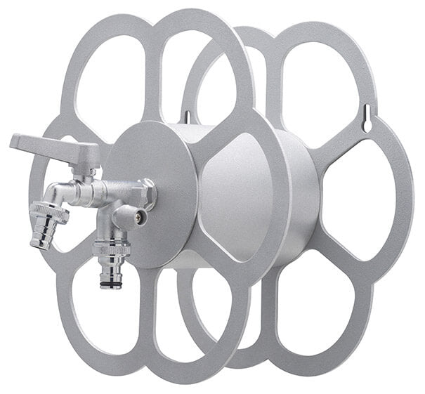 Pratico portatubo a muro che permette di trasformare un semplice rubinetto in un elemento funzionale e decorativodove riporre ordinatamente il tubo da innaffio, tenendolo sempre collegato al rubinetto secondario.
