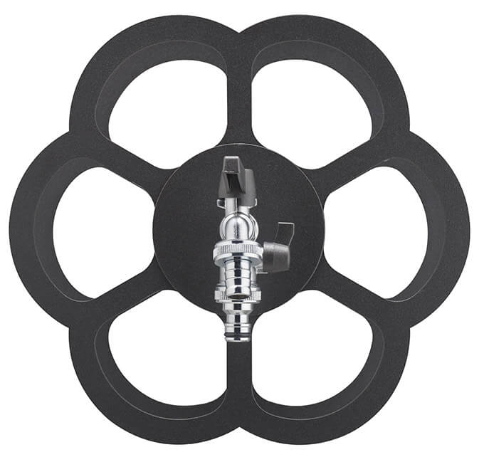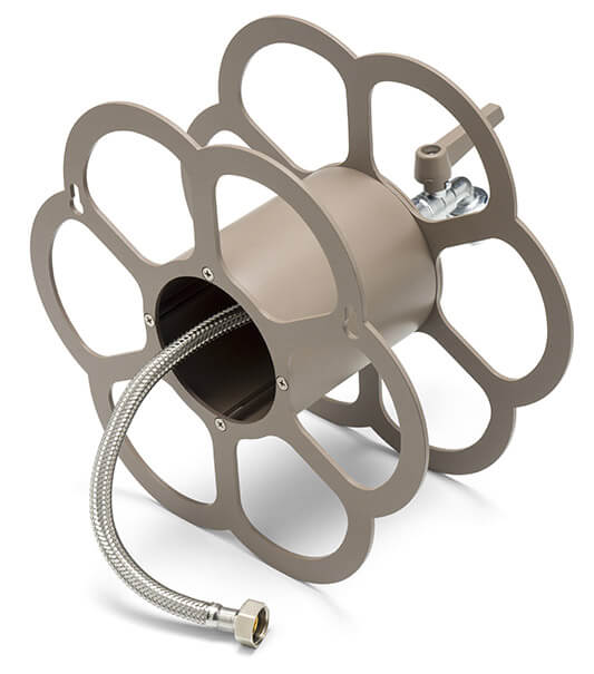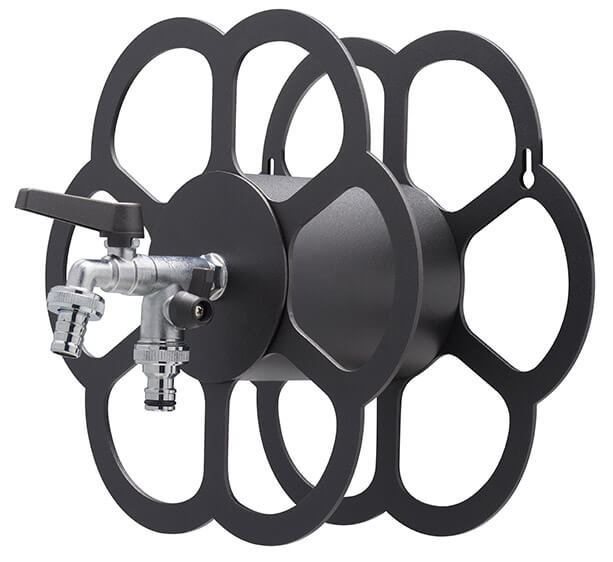 Pratico portatubo a muro che permette di trasformare un semplice rubinetto in un elemento funzionale e decorativodove riporre ordinatamente il tubo da innaffio, tenendolo sempre collegato al rubinetto secondario.