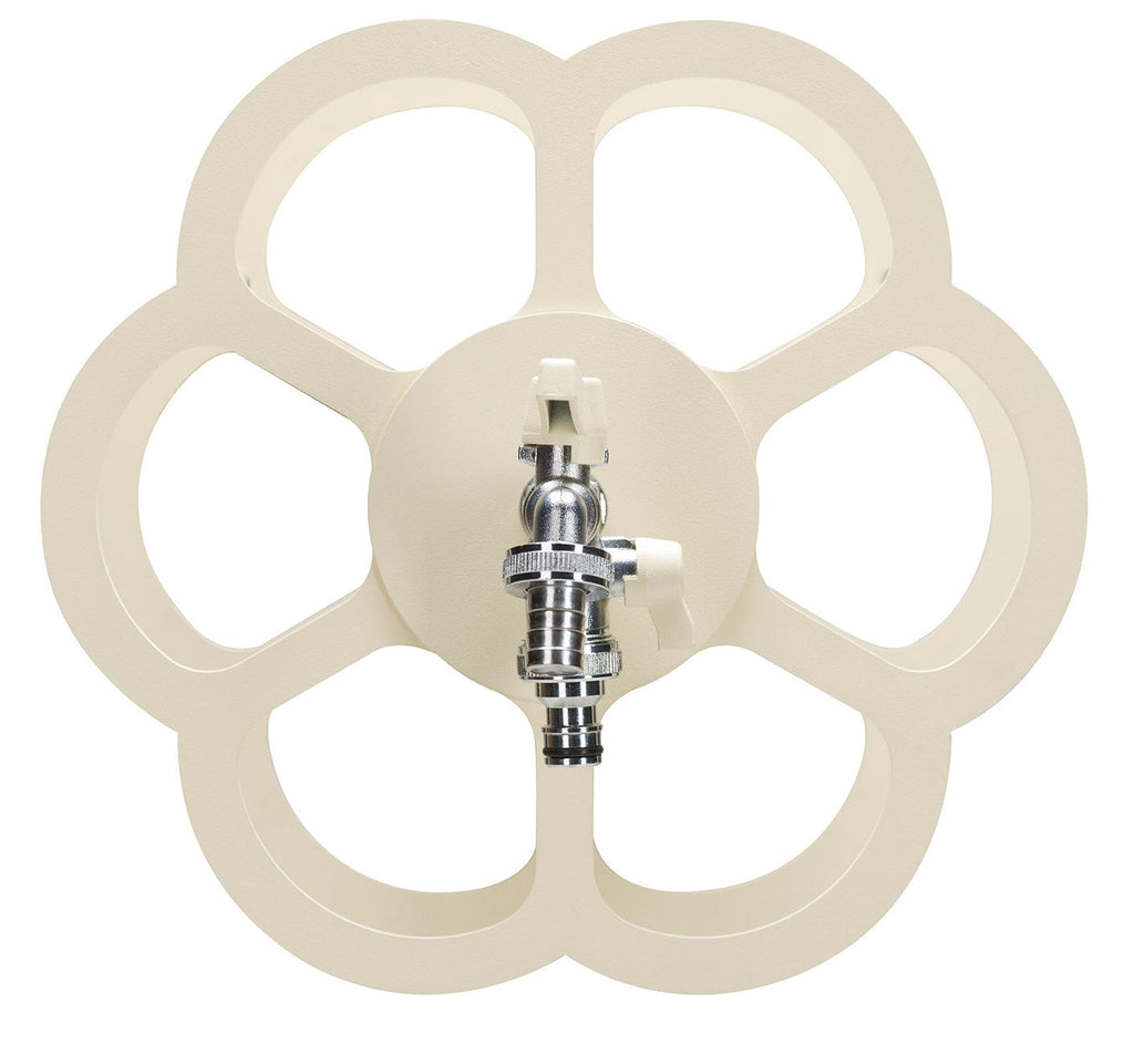 Pratico portatubo a muro che permette di trasformare un semplice rubinetto in un elemento funzionale e decorativodove riporre ordinatamente il tubo da innaffio, tenendolo sempre collegato al rubinetto secondario.