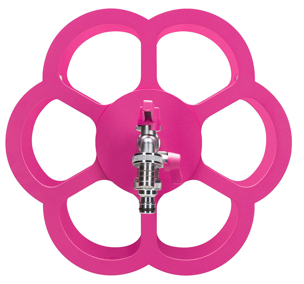 Pratico portatubo a muro che permette di trasformare un semplice rubinetto in un elemento funzionale e decorativodove riporre ordinatamente il tubo da innaffio, tenendolo sempre collegato al rubinetto secondario.