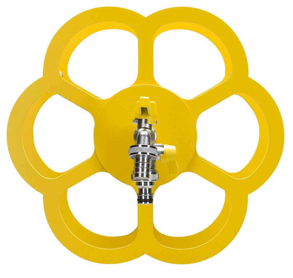 Pratico portatubo a muro che permette di trasformare un semplice rubinetto in un elemento funzionale e decorativodove riporre ordinatamente il tubo da innaffio, tenendolo sempre collegato al rubinetto secondario.