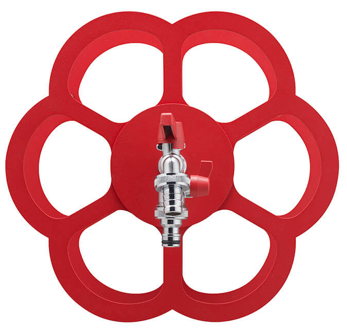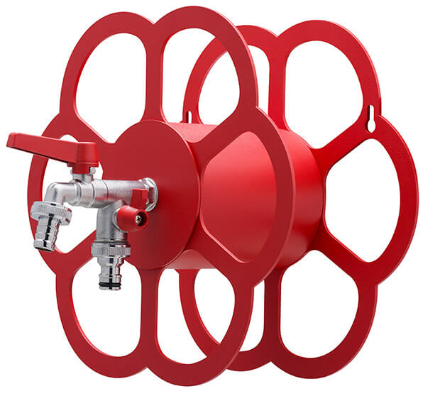 Pratico portatubo a muro che permette di trasformare un semplice rubinetto in un elemento funzionale e decorativodove riporre ordinatamente il tubo da innaffio, tenendolo sempre collegato al rubinetto secondario.