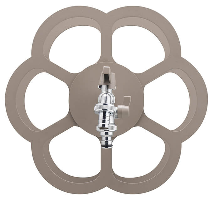 Pratico portatubo a muro che permette di trasformare un semplice rubinetto in un elemento funzionale e decorativodove riporre ordinatamente il tubo da innaffio, tenendolo sempre collegato al rubinetto secondario.