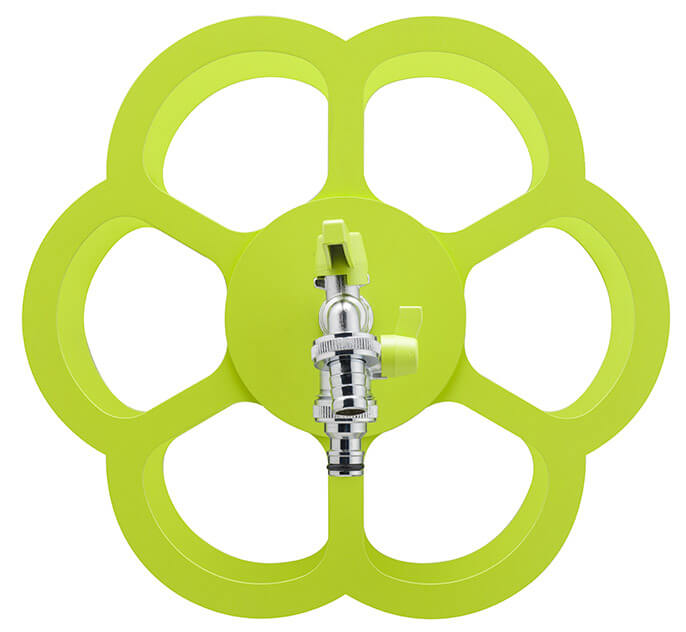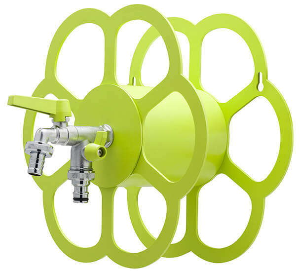 Pratico portatubo a muro che permette di trasformare un semplice rubinetto in un elemento funzionale e decorativodove riporre ordinatamente il tubo da innaffio, tenendolo sempre collegato al rubinetto secondario.