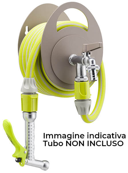 Pratico portatubo a muro che permette di trasformare un semplice rubinetto in un elemento funzionale e decorativodove riporre ordinatamente il tubo da innaffio, tenendolo sempre collegato al rubinetto secondario.