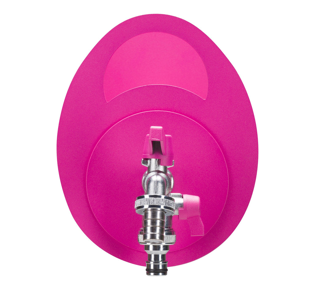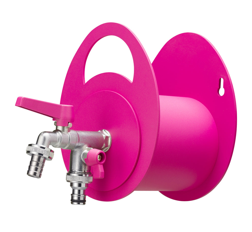 Pratico portatubo a muro che permette di trasformare un semplice rubinetto in un elemento funzionale e decorativodove riporre ordinatamente il tubo da innaffio, tenendolo sempre collegato al rubinetto secondario.