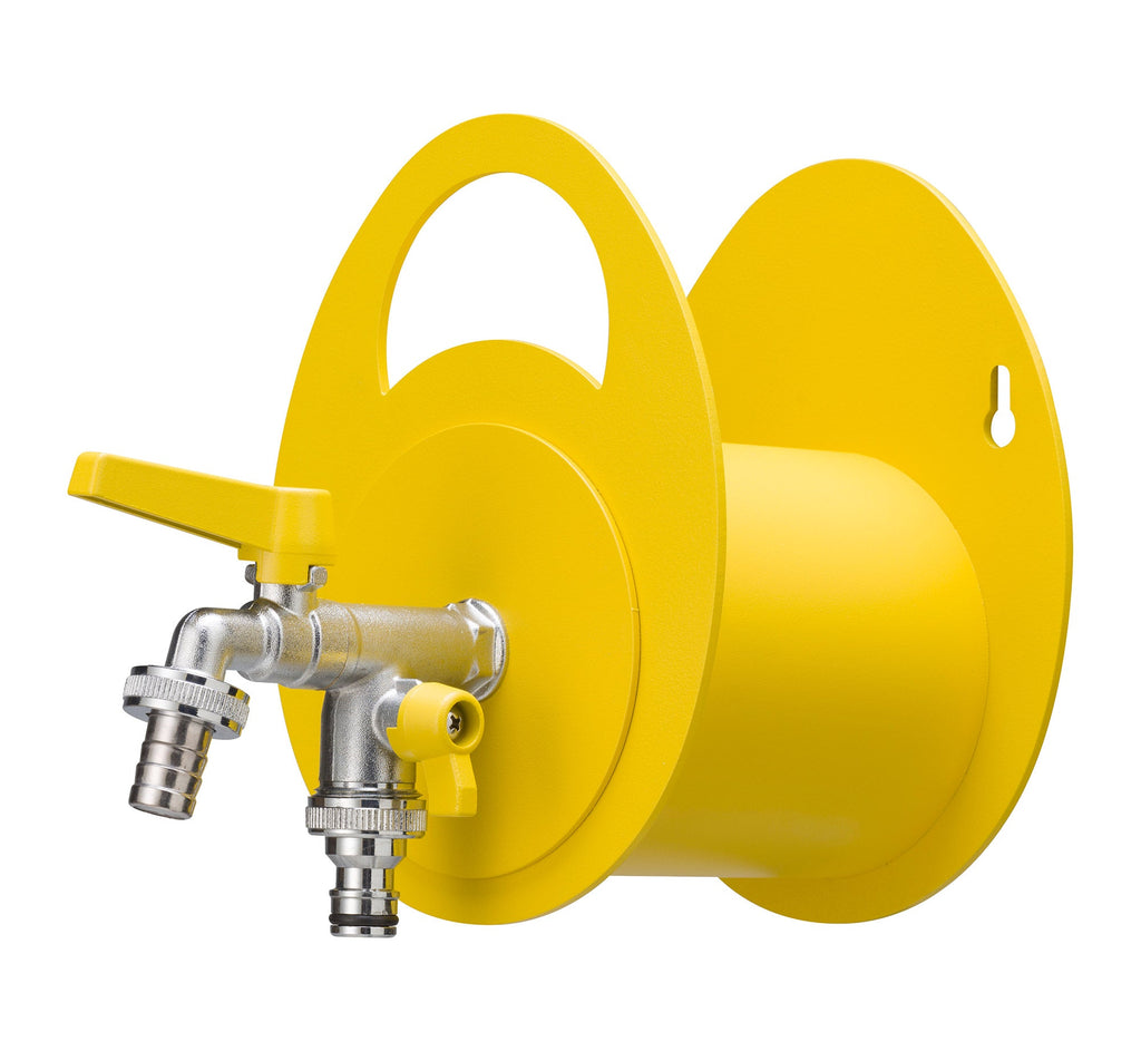 Pratico portatubo a muro che permette di trasformare un semplice rubinetto in un elemento funzionale e decorativodove riporre ordinatamente il tubo da innaffio, tenendolo sempre collegato al rubinetto secondario.